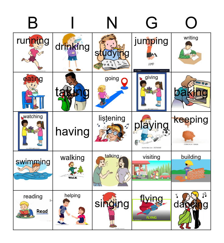 This bingo card has 23 images, a free space and 24 words: walking, helping, going, reading, writing, running, eating, drinking, playing, talking, giving, watching, visiting, building, taking, flying, keeping, studying, baking, having, dancing, swimming, jumping and singing.