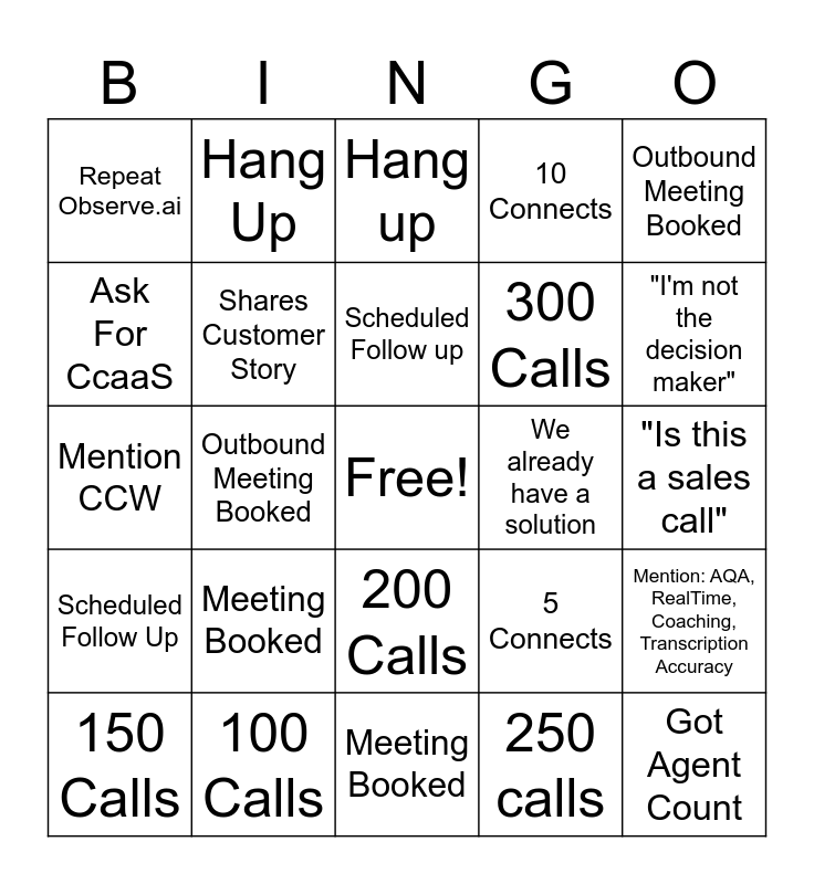 This bingo card has a free space and 24 words: Meeting Booked, 100 Calls, Scheduled Follow up, 150 Calls, Outbound Meeting Booked, Repeat Observe.ai, Ask For CcaaS, Hang Up, We already have a solution, 200 Calls, 300 Calls, Mention CCW, 5 Connects, Mention: AQA, RealTime, Coaching, Transcription Accuracy, Shares Customer Story, 250 calls, "Is this a sales call", Hang up, "I'm not the decision maker", Outbound Meeting Booked, Got Agent Count, Scheduled Follow Up, 10 Connects and Meeting Booked.
