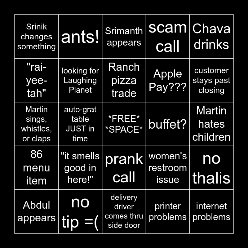 This bingo card has a free space and 24 words: "it smells good in here!", no tip =(, Ranch pizza trade, Abdul appears, Chava drinks, Srinik changes something, "rai-yee-tah", ants!, buffet?, prank call, Apple Pay???, Martin sings, whistles, or claps, women's restroom issue, no thalis, looking for Laughing Planet, printer problems, Martin hates children, Srimanth appears, customer stays past closing, auto-grat table JUST in time, internet problems, 86 menu item, scam call and delivery driver comes thru side door.