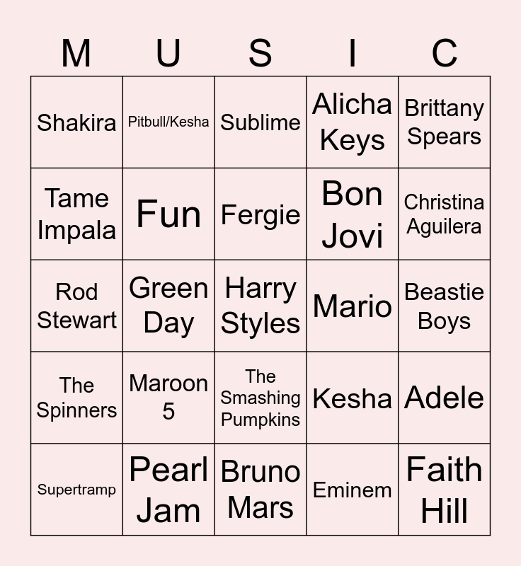 This bingo card has 50 words: OneRepublic, Harry Styles, Billy Eilish, Bruno Mars, Maroon 5, Megan Trainor, Pitbull/Kesha, Twenty-One Pilots, Tame Impala, Justin Timberlake/JAY-Z, Fun, Alicha Keys, Adele, Kesha, Flo-Rida, Rihanna, Fergie, Mario, 50 Cent, Brittany Spears, Green Day, Eminem, Shakira, Bon Jovi, Destiny's Child, Faith Hill, Christina Aguilera, New Radicals, Sublime, The Smashing Pumpkins, TLC, Beck, Lenny Kravitz, Billy Ray Cyrus, Pearl Jam, Billy Idol, R.E.M., Bobby Brown, Def Leppard, Beastie Boys, Bangles, Michael Jackson, The Police, Queen, Supertramp, Rod Stewart, Heart, ABBA, The Spinners and Jim Croce.