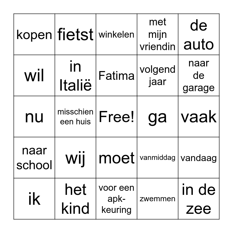 This bingo card has a free space and 24 words: wij, het kind, Fatima, ik, de auto, kopen, wil, fietst, ga, moet, volgend jaar, nu, vanmiddag, vandaag, in Italië, zwemmen, vaak, winkelen, naar de garage, misschien een huis, in de zee, naar school, met mijn vriendin and voor een apk- keuring.
