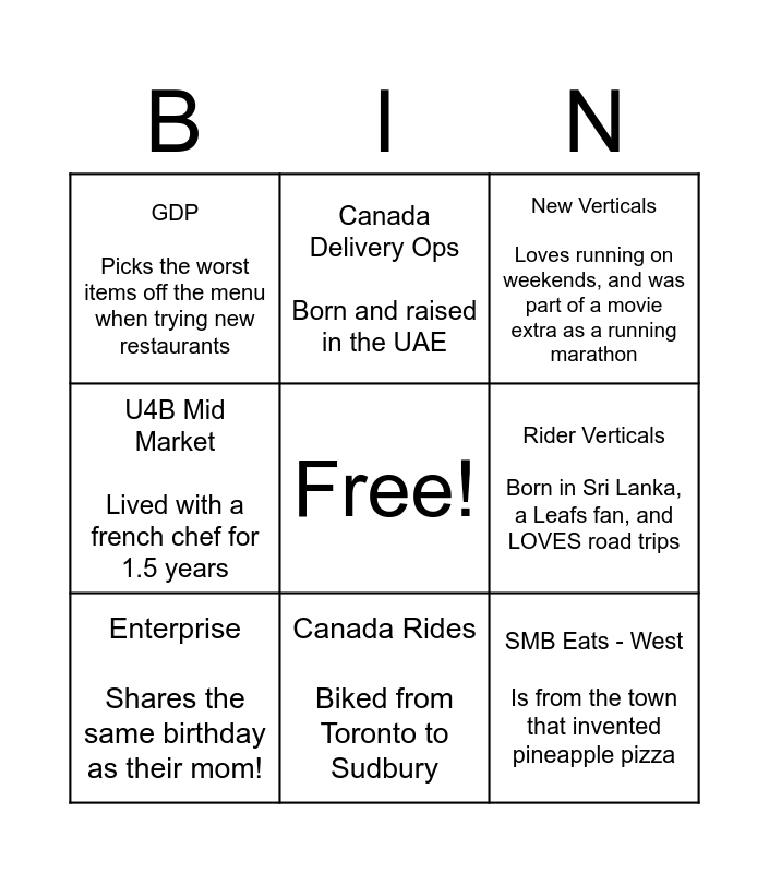 This bingo card has a free space and 8 words: Rider Verticals Born in Sri Lanka, a Leafs fan, and LOVES road trips, New Verticals Loves running on weekends, and was part of a movie extra as a running marathon, Canada Delivery Ops Born and raised in the UAE, Enterprise Shares the same birthday as their mom!, GDP Picks the worst items off the menu when trying new restaurants, SMB Eats - West Is from the town that invented pineapple pizza, U4B Mid Market Lived with a french chef for 1.5 years and Canada Rides Biked from Toronto to Sudbury.