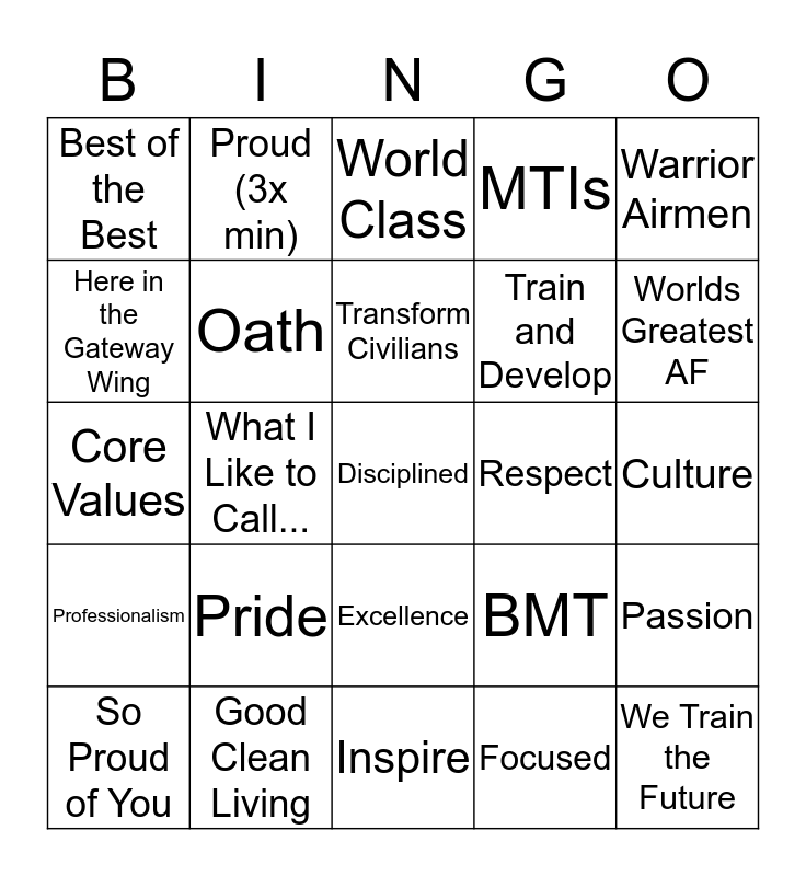 This bingo card has 25 words: Pride, Inspire, Transform Civilians, So Proud of You, Warrior Airmen, Best of the Best, Here in the Gateway Wing, Proud (3x min), Respect, Excellence, Train and Develop, Core Values, BMT, Passion, Oath, We Train the Future, Culture, World Class, Worlds Greatest AF, What I Like to Call..., Disciplined, Good Clean Living, Professionalism, MTIs and Focused.