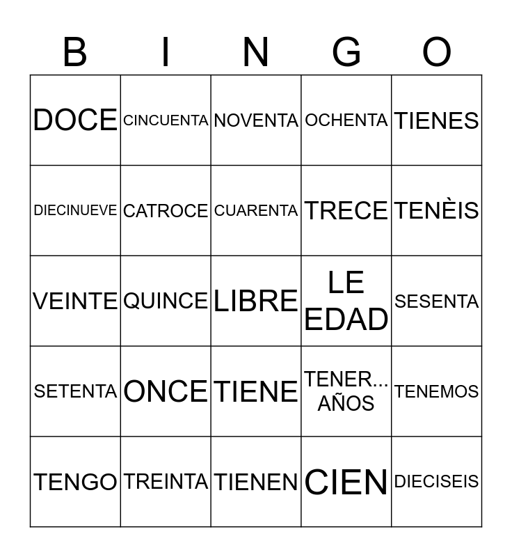 This bingo card has a free space and 24 words: ONCE, TREINTA, CUARENTA, TENGO, TIENES, DOCE, DIECINUEVE, CINCUENTA, LE EDAD, TIENE, TRECE, VEINTE, TENER... AÑOS, TENEMOS, CATROCE, CIEN, SESENTA, NOVENTA, TENÈIS, QUINCE, DIECISEIS, SETENTA, OCHENTA and TIENEN.