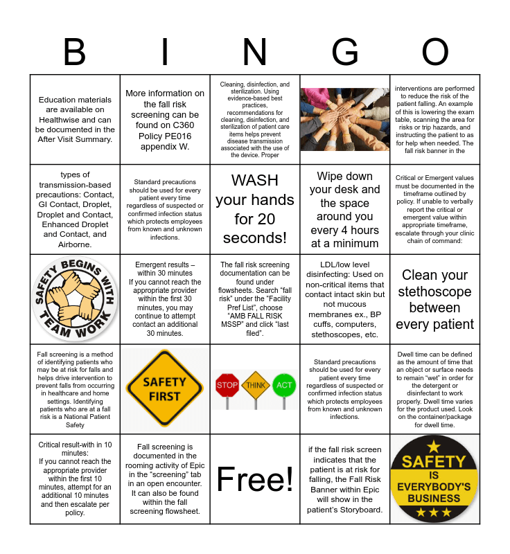 This bingo card has 5 images and 20 words: Fall screening is a method of identifying patients who may be at risk for falls and helps drive intervention to prevent falls from occurring in healthcare and home settings. Identifying patients who are at a fall risk is a National Patient Safety, Fall screening is documented in the rooming activity of Epic in the “screening” tab in an open encounter. It can also be found within the fall screening flowsheet., The fall risk screening documentation can be found under flowsheets. Search “fall risk” under the “Facility Pref List”, choose “AMB FALL RISK MSSP” and click “last filed”., if the fall risk screen indicates that the patient is at risk for falling, the Fall Risk Banner within Epic will show in the patient’s Storyboard., interventions are performed to reduce the risk of the patient falling. An example of this is lowering the exam table, scanning the area for risks or trip hazards, and instructing the patient to as for help when needed. The fall risk banner in the, Education materials are available on Healthwise and can be documented in the After Visit Summary., More information on the fall risk screening can be found on C360 Policy PE016 appendix W., Cleaning, disinfection, and sterilization. Using evidence-based best practices, recommendations for cleaning, disinfection, and sterilization of patient care items helps prevent disease transmission associated with the use of the device. Proper, LDL/low level disinfecting: Used on non-critical items that contact intact skin but not mucous membranes ex., BP cuffs, computers, stethoscopes, etc., Dwell time can be defined as the amount of time that an object or surface needs to remain “wet” in order for the detergent or disinfectant to work properly. Dwell time varies for the product used. Look on the container/package for dwell time., types of transmission-based precautions: Contact, GI Contact, Droplet, Droplet and Contact, Enhanced Droplet and Contact, and Airborne., Standard precautions should be used for every patient every time regardless of suspected or confirmed infection status which protects employees from known and unknown infections., Free!, Standard precautions should be used for every patient every time regardless of suspected or confirmed infection status which protects employees from known and unknown infections., Critical or Emergent values must be documented in the timeframe outlined by policy. If unable to verbally report the critical or emergent value within appropriate timeframe, escalate through your clinic chain of command:, Critical result-with in 10 minutes: If you cannot reach the appropriate provider within the first 10 minutes, attempt for an additional 10 minutes and then escalate per policy., Emergent results – within 30 minutes If you cannot reach the appropriate provider within the first 30 minutes, you may continue to attempt contact an additional 30 minutes., WASH your hands for 20 seconds!, Wipe down your desk and the space around you every 4 hours at a minimum and Clean your stethoscope between every patient.