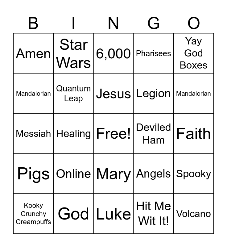 This bingo card has a free space and 24 words: Online, God, Jesus, Kooky Crunchy Creampuffs, Yay God Boxes, Amen, Mandalorian, Star Wars, Deviled Ham, Mary, Legion, Messiah, Angels, Spooky, Quantum Leap, Hit Me Wit It!, Faith, 6,000, Mandalorian, Healing, Volcano, Pigs, Pharisees and Luke.