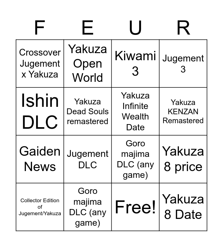 This bingo card has 18 words: Jugement DLC, Yakuza 8 Date, Kiwami 3, Crossover Jugement x Yakuza, Goro majima DLC (any game), Jugement 3, Collector Edition of Jugement/Yakuza, Yakuza Open World, Yakuza KENZAN Remastered, Gaiden News, Free!, Ishin DLC, Yakuza 8 price, Yakuza Dead Souls remastered, Yakuza Infinite Wealth Date, Goro Voice Actor be there, Goro majima DLC (any game) and Yakuza Infinite Wealth Date.