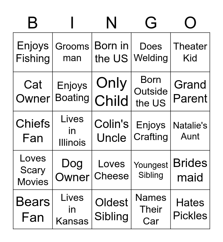 This bingo card has 25 words: Dog Owner, Oldest Sibling, Only Child, Bears Fan, Theater Kid, Enjoys Fishing, Cat Owner, Grooms man, Enjoys Crafting, Loves Cheese, Born Outside the US, Chiefs Fan, Youngest Sibling, Brides maid, Enjoys Boating, Hates Pickles, Natalie's Aunt, Born in the US, Grand Parent, Lives in Illinois, Colin's Uncle, Lives in Kansas, Loves Scary Movies, Does Welding and Names Their Car.