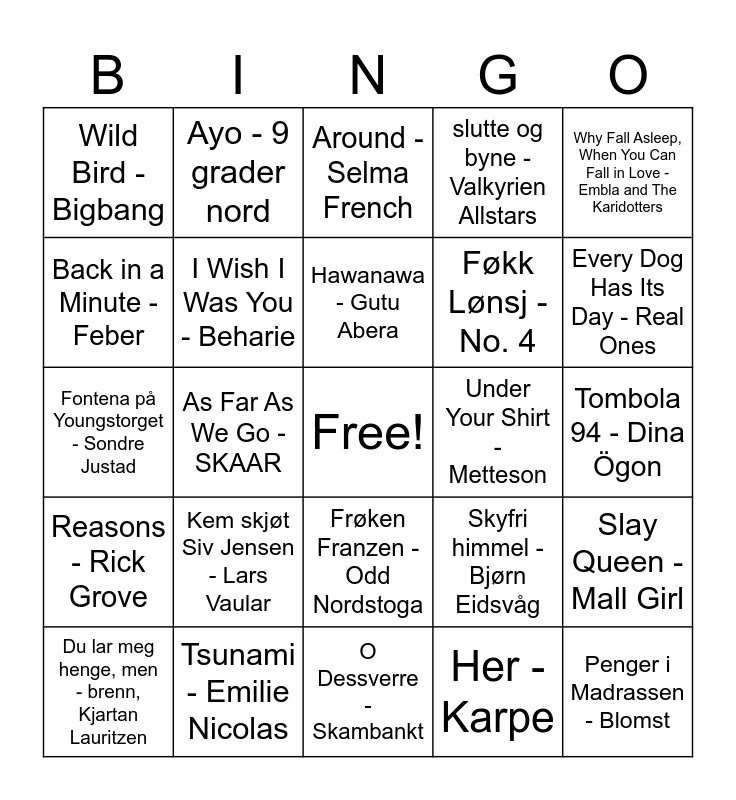 This bingo card has a free space and 38 words: Den finast eg veit - Hellbillies, Bislett Stadion - Oslo Ess, Angels Among Us - ARY, I Wish I Was You - Beharie, Slay Queen - Mall Girl, Kem skjøt Siv Jensen - Lars Vaular, Hawanawa - Gutu Abera, There is Nothing New Under The Sun - Slomosa, Why Fall Asleep, When You Can Fall in Love - Embla and The Karidotters, Føkk Lønsj - No. 4, As Far As We Go - SKAAR, slutte og byne - Valkyrien Allstars, Penger i Madrassen - Blomst, Tombola 94 - Dina Ögon, Back in a Minute - Feber, Reasons - Rick Grove, Waiting - Signe Marie Rustad, Around - Selma French, Little Sister - Thea & The Wild, Under Your Shirt - Metteson, Wild Bird - Bigbang, Tsunami - Emilie Nicolas, Every Dog Has Its Day - Real Ones, Du lar meg henge, men - brenn, Kjartan Lauritzen, Fast Food - Fish, O Dessverre - Skambankt, Er dette alt - Cezinando, Chirag, Fa-Fa-Fa - Datarock, Togsang - Moddi, Resten av ditt liv - Timbuktu, Susann - Sudan Dudan, Frøken Franzen - Odd Nordstoga, Her - Karpe, Ayo - 9 grader nord, Etter ein rangel/Fitakaleerie - Vinjefolk, Skyfri himmel - Bjørn Eidsvåg, Fontena på Youngstorget - Sondre Justad and Sentimentalist - Sondre Lerche.