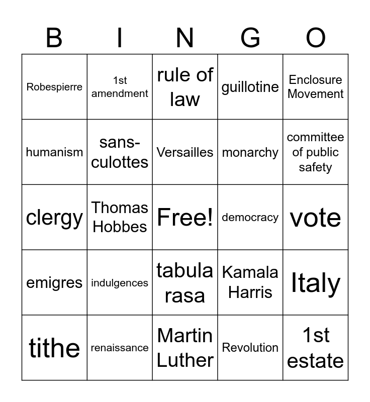 This bingo card has a free space and 24 words: tithe, indulgences, Versailles, Revolution, Enclosure Movement, Robespierre, 1st amendment, rule of law, democracy, vote, clergy, sans-culottes, Kamala Harris, Italy, humanism, renaissance, Martin Luther, guillotine, committee of public safety, emigres, Thomas Hobbes, tabula rasa, monarchy and 1st estate.