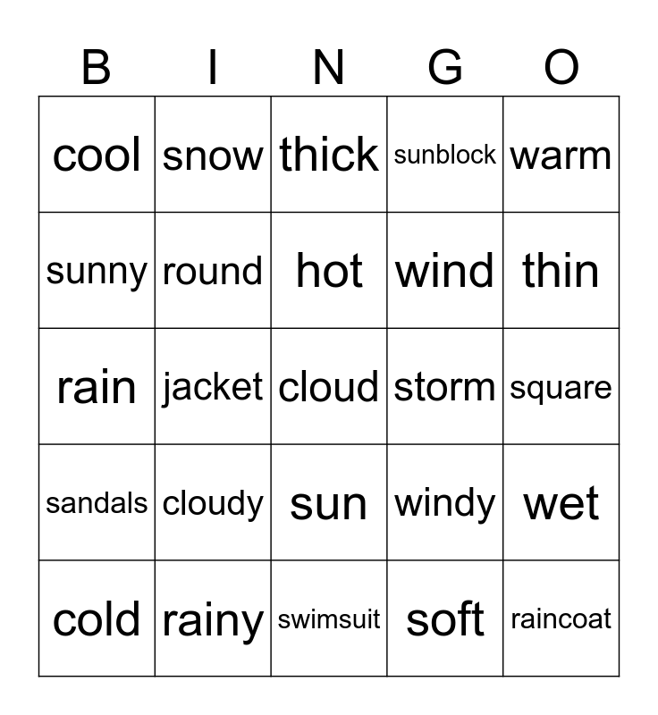 This bingo card has a free space and 24 words: cloudy, rainy, hot, cold, warm, cool, sunny, snow, storm, sun, wind, rain, windy, wet, round, soft, square, thick, thin, jacket, raincoat, sandals, sunblock and swimsuit.