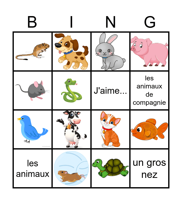This bingo card has 12 images and 4 words: les animaux, les animaux de compagnie, J'aime... and un gros nez.