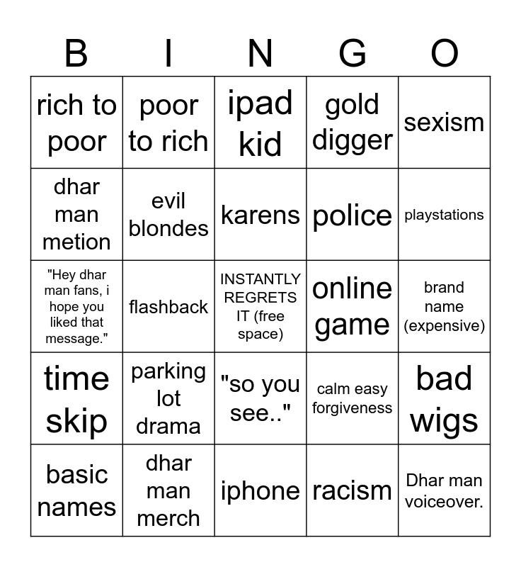 This bingo card has a free space and 24 words: basic names, parking lot drama, karens, racism, sexism, rich to poor, poor to rich, ipad kid, online game, brand name (expensive), "Hey dhar man fans, i hope you liked that message.", evil blondes, calm easy forgiveness, bad wigs, dhar man metion, dhar man merch, iphone, gold digger, playstations, time skip, flashback, "so you see..", police and Dhar man voiceover..