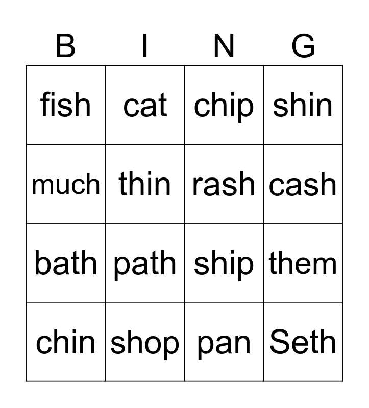 This bingo card has 16 words: shop, them, chip, fish, bath, cat, ship, pan, much, thin, chin, shin, path, cash, rash and Seth.