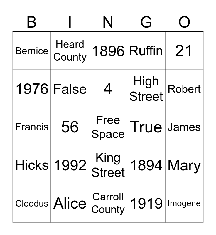 This bingo card has a free space and 24 words: 1992, Alice, 4, Cleodus, 21, Bernice, 1976, Heard County, True, King Street, High Street, Francis, 1894, Mary, False, 1919, James, 1896, Robert, 56, Imogene, Hicks, Ruffin and Carroll County.