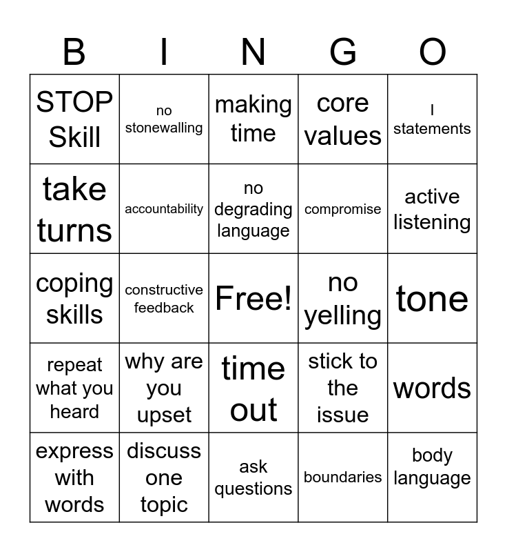 This bingo card has a free space and 24 words: why are you upset, discuss one topic, no degrading language, express with words, I statements, STOP Skill, take turns, no stonewalling, no yelling, time out, compromise, coping skills, stick to the issue, words, accountability, boundaries, tone, making time, active listening, constructive feedback, body language, repeat what you heard, core values and ask questions.