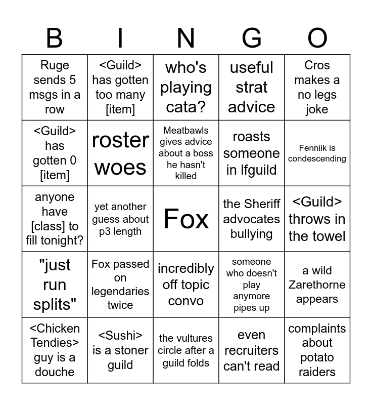 This bingo card has a free space and 24 words: Fox passed on legendaries twice, <Sushi> is a stoner guild, Meatbawls gives advice about a boss he hasn't killed, <Chicken Tendies> guy is a douche, Cros makes a no legs joke, Ruge sends 5 msgs in a row, <Guild> has gotten 0 [item], <Guild> has gotten too many [item], the Sheriff advocates bullying, incredibly off topic convo, roasts someone in lfguild, anyone have [class] to fill tonight?, someone who doesn't play anymore pipes up, a wild Zarethorne appears, roster woes, even recruiters can't read, <Guild> throws in the towel, who's playing cata?, Fenniik is condescending, yet another guess about p3 length, complaints about potato raiders, "just run splits", useful strat advice and the vultures circle after a guild folds.