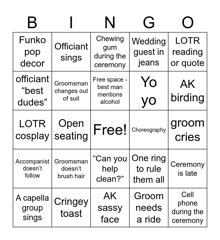 This bingo card has a free space and 26 words: “Can you help clean?”, Groom needs a ride, Free space - best man mentions alcohol, Cringey toast, LOTR reading or quote, Funko pop decor, officiant “best dudes”, Officiant sings, groom cries, One ring to rule them all, Yo yo, LOTR cosplay, Ceremony is late, A capella group sings, Open seating, Dinner is a clusterfuck, Wedding guest in jeans, Accompanist doesn’t follow, Chewing gum during the ceremony, Cell phone during the ceremony, AK birding, AK sassy face, Choreography, Groomsman doesn’t brush hair, Groomsman changes out of suit and Hobbit feet.