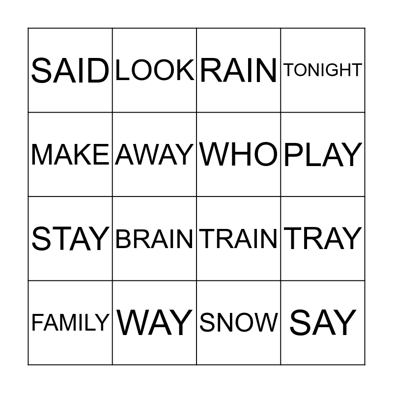 This bingo card has 16 words: WAY, TRAY, RAIN, SAID, STAY, LOOK, TRAIN, SNOW, MAKE, AWAY, FAMILY, TONIGHT, BRAIN, PLAY, WHO and SAY.