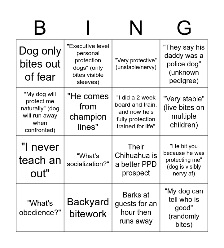 This bingo card has 16 words: Backyard bitework, "He bit you because he was protecting me" (dog is visibly nervy af), "Very protective" (unstable/nervy), Dog only bites out of fear, "I never teach an out", "Executive level personal protection dogs" (only bites visible sleeves), Their Chihuahua is a better PPD prospect, Barks at guests for an hour then runs away, "My dog will protect me naturally" (dog will run away when confronted), "He comes from champion lines", "What's obedience?", "They say his daddy was a police dog" (unknown pedigree), "What's socialization?", "Very stable" (live bites on multiple children), "I did a 2 week board and train, and now he's fully protection trained for life" and "My dog can tell who is good" (randomly bites).