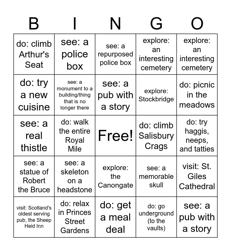 This bingo card has a free space and 34 words: do: rub Bobby's nose, do: go underground (to the vaults), do: walk [part of] the Water of Leith, visit: a repurposed church, see: a statue of Robert the Bruce, see: a monument to a building/thing that is no longer there, explore: an interesting cemetery, visit: Scotland's oldest serving pub, the Sheep Heid Inn, see: a police box, do: get a great photo of Edinburgh from above, see: a pub with a story, see: a repurposed police box, do: visit the Piemaker, explore: the New Town, do: climb Salisbury Crags, do: picnic in the meadows, do: relax in Princes Street Gardens, see: a real thistle, see: a skeleton on a headstone, see: a memorable skull, explore: the Canongate, do: visit the Scottish Parliament, do: climb Arthur's Seat, do: try haggis, neeps, and tatties, do: get a meal deal, see: a pub with a story, explore: an interesting cemetery, visit: a food market, explore: Stockbridge, do: try a new cuisine, explore: a charity shop, do: walk the entire Royal Mile, visit: St. Giles Cathedral and visit: a repurposed church.