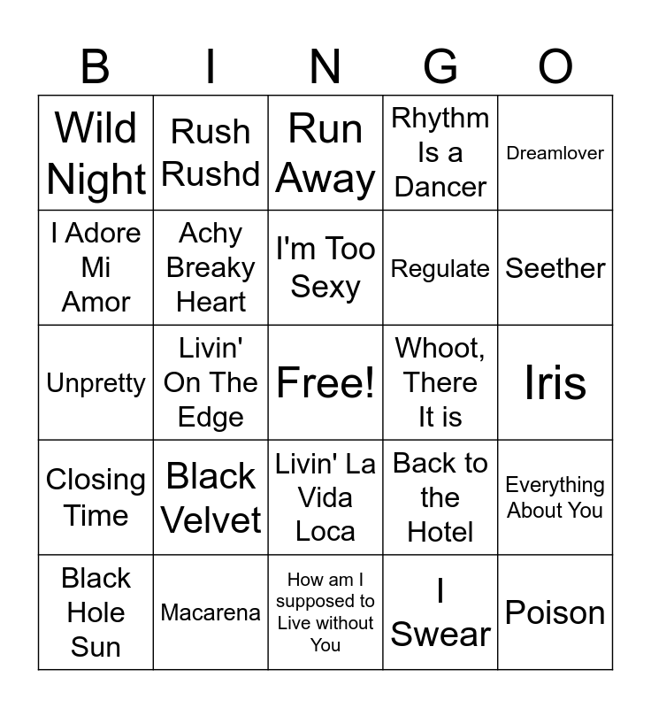 This bingo card has a free space and 51 words: Ice Ice Baby, Poison, Blaze of Glory, How am I supposed to Live without You, Black Velvet, Release Me, Rush Rushd, More than words, I Adore Mi Amor, Black or White, Achy Breaky Heart, Rhythm Is a Dancer, Everything About You, Back to the Hotel, Jump Around, Baby-Baby-Baby, I'm Too Sexy, Whoot, There It is, I don't wanna Fight, Dreamlover, Livin' On The Edge, I Swear, Wild Night, Regulate, Zombie, Let Her Cry, Seether, Indian Outlaw, Black Hole Sun, Run Away, Cotton Eye Joe, I Wish, Santa Monica, Pepper, 3 AM, Macarena, Semi-Charmed Life, How Do I Live, Men in Black, One Week, Iris, Closing Time, When the lights Go Out, Fly Away, Dragula, Every Morning, Unpretty, All Star, Smooth, Livin' La Vida Loca and Scar Tissue.