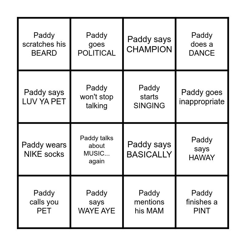 This bingo card has 20 words: Paddy says HAWAY, Paddy CRACKS his fingers, Paddy says CHAMPION, Paddy gets another CARD, Paddy calls you PET, Paddy says LUV YA PET, Paddy says WAYE AYE, Paddy scratches his BEARD, Paddy wears NIKE socks, Paddy goes POLITICAL, Paddy talks about MUSIC... again, Paddy says BASICALLY, Paddy won't stop talking, Paddy finishes a PINT, Paddy starts SINGING, Paddy takes a SHOT, Paddy goes inappropriate, Paddy does a DANCE, Paddy mentions his MAM and Paddy gets in a DEBATE.
