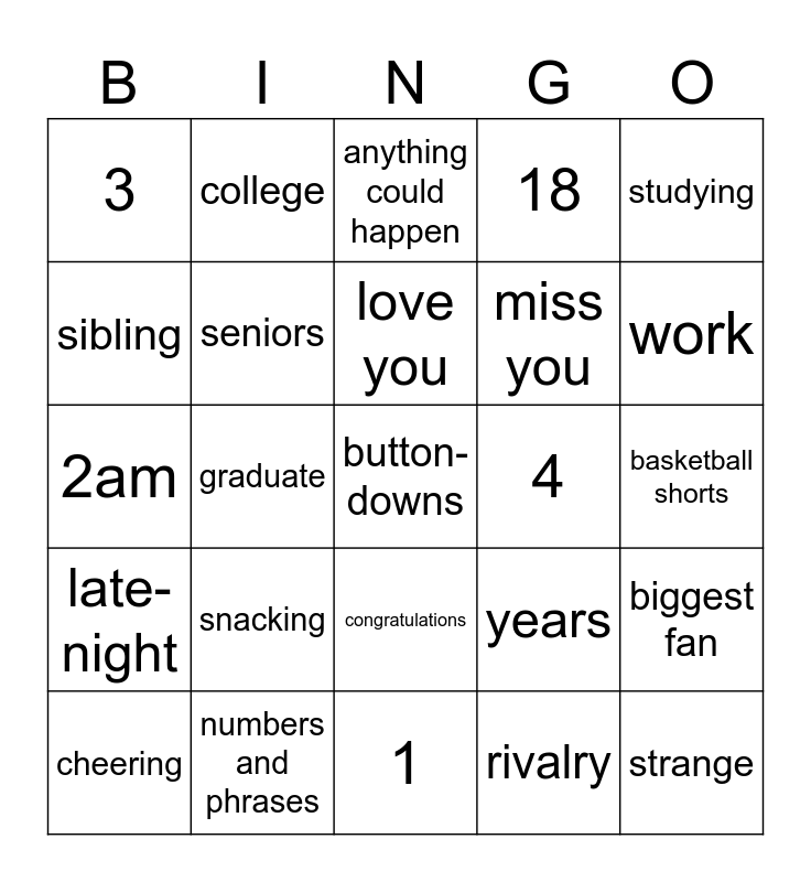 This bingo card has 30 words: numbers and phrases, older sister, graduate, cookies, 3, anything could happen, seniors, congratulations, 4, 1, basketball shorts, button-downs, rivalry, strange, work, high schooler, years, late-night, snacking, studying, 2am, 3am, college, miss you, sibling, 18, biggest fan, cheering, love you and good luck.