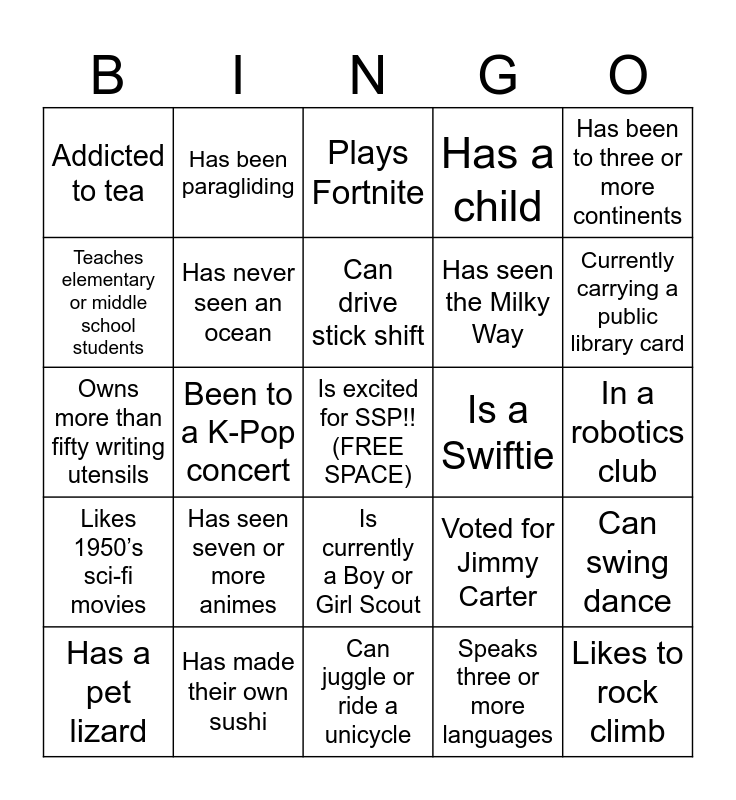 This bingo card has a free space and 29 words: Has a pet lizard, Bikes everywhere!, Been to a K-Pop concert, Plays three or more instruments, Addicted to tea, Plays Fortnite, Has never seen an ocean, Has seen seven or more animes, Is a Swiftie, Has made their own sushi, In a robotics club, Likes to rock climb, Can juggle or ride a unicycle, Speaks three or more languages, Currently carrying a public library card, Has seen neither Star Trek nor Star Wars, Is currently a Boy or Girl Scout, Likes 1950’s sci-fi movies, Has been to three or more continents, Owns more than fifty writing utensils, Voted for Jimmy Carter, Practices a combat sport, Has seen the Milky Way, Teaches elementary or middle school students, Has a child, Has been paragliding, Can swing dance, Can drive stick shift and Has more than 1000 followers on a single platform.