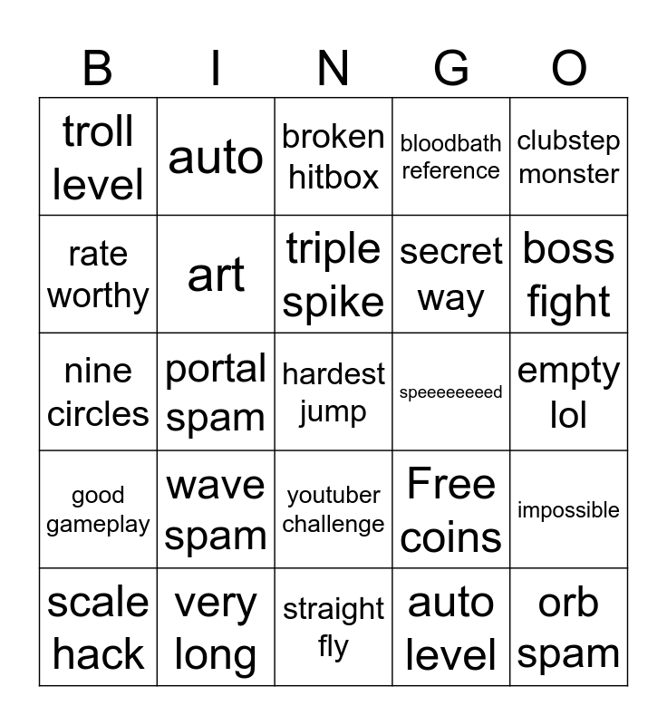 This bingo card has 25 words: wave spam, straight fly, triple spike, scale hack, clubstep monster, troll level, rate worthy, auto, speeeeeeeed, youtuber challenge, secret way, nine circles, Free coins, impossible, art, orb spam, empty lol, broken hitbox, boss fight, portal spam, hardest jump, very long, good gameplay, bloodbath reference and auto level.