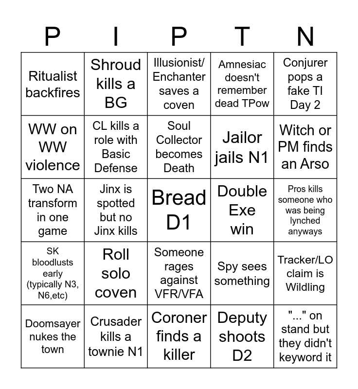 This bingo card has a free space and 24 words: Roll solo coven, Crusader kills a townie N1, Soul Collector becomes Death, Doomsayer nukes the town, Conjurer pops a fake TI Day 2, Ritualist backfires, WW on WW violence, Shroud kills a BG, Double Exe win, Someone rages against VFR/VFA, Jailor jails N1, Two NA transform in one game, Spy sees something, Tracker/LO claim is Wildling, CL kills a role with Basic Defense, Deputy shoots D2, Pros kills someone who was being lynched anyways, Illusionist/ Enchanter saves a coven, Witch or PM finds an Arso, Jinx is spotted but no Jinx kills, "..." on stand but they didn't keyword it, SK bloodlusts early (typically N3, N6,etc), Amnesiac doesn't remember dead TPow and Coroner finds a killer.