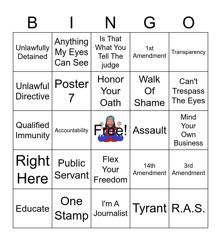This bingo card has a free space and 46 words: CAMBACK, R.A.S., Name & Badge Number, I'm A Journalist, Public Servant, I'm Your Boss, Anything My Eyes Can See, Am I being Detained?, Unlawful Directive, No Expectation Of Privacy in Public, Poster 7, 1st Amendment, 3rd Amendment, 14th Amendment, I Was Just About to Leave, Trespass From Public, Honor Your Oath, Assault, Battery, Transparency, Accountability, Tyrant, Unlawfully Detained, Walk Of Shame, Free to Go, Free to Stay, Can't Trespass The Eyes, Educate, Pepper Spray, Flex Your Freedom, Right Here, Uno Reverse, Flip The Script, Create Your Own Privacy, Don't Go Out In Public, Your Feelings Don't Trump Rights, One Stamp, Mind Your Own Business, This is My Business, There Is No Sign, The Sign Has No UCC, Deescalate, Is That What You Tell The judge, Qualified Immunity, FOIA, Complaint Form and You’re Dismissed.