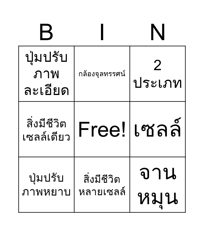 This bingo card has a free space and 8 words: เซลล์, 2 ประเภท, กล้องจุลทรรศน์, ปุ่มปรับภาพหยาบ, ปุ่มปรับภาพละเอียด, จานหมุน, สิ่งมีชีวิตเซลล์เดียว and สิ่งมีชีวิตหลายเซลล์.
