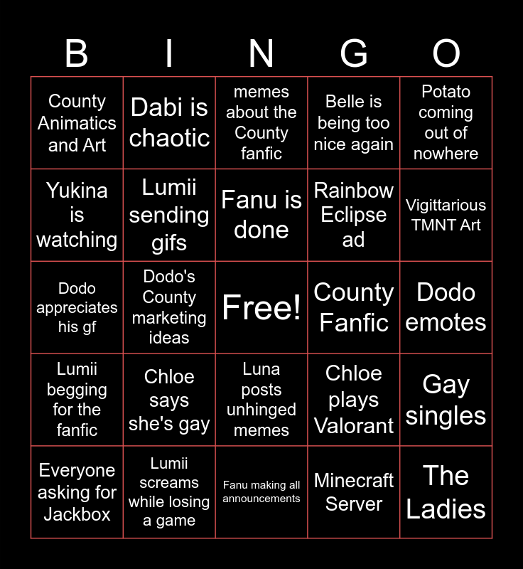 This bingo card has a free space and 24 words: Chloe says she's gay, Lumii screams while losing a game, Fanu is done, Everyone asking for Jackbox, Potato coming out of nowhere, County Animatics and Art, Yukina is watching, Dabi is chaotic, County Fanfic, Luna posts unhinged memes, Rainbow Eclipse ad, Dodo appreciates his gf, Chloe plays Valorant, Gay singles, Lumii sending gifs, Minecraft Server, Dodo emotes, memes about the County fanfic, Vigittarious TMNT Art, Dodo's County marketing ideas, The Ladies, Lumii begging for the fanfic, Belle is being too nice again and Fanu making all announcements.