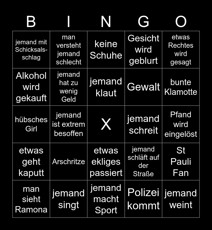 This bingo card has a free space and 24 words: Arschritze, jemand singt, jemand klaut, man sieht Ramona, etwas Rechtes wird gesagt, jemand mit Schicksals-schlag, Alkohol wird gekauft, man versteht jemand schlecht, jemand schreit, etwas ekliges passiert, Gewalt, hübsches Girl, jemand schläft auf der Straße, St Pauli Fan, jemand hat zu wenig Geld, Polizei kommt, Pfand wird eingelöst, keine Schuhe, bunte Klamotte, jemand ist extrem besoffen, jemand weint, etwas geht kaputt, Gesicht wird geblurt and jemand macht Sport.
