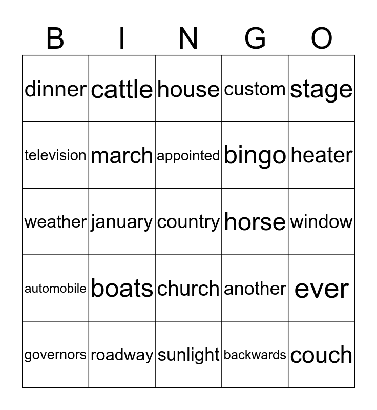 This bingo card has 25 words: boats, sunlight, appointed, governors, stage, dinner, television, cattle, horse, church, bingo, weather, another, ever, march, couch, window, house, heater, january, country, roadway, automobile, custom and backwards.