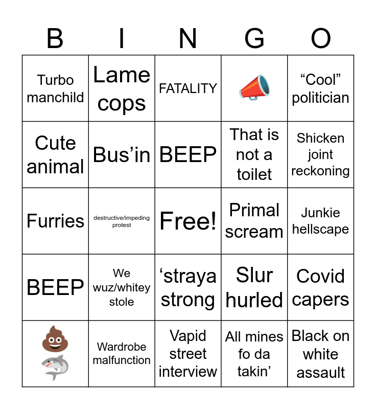 This bingo card has a free space and 24 words: We wuz/whitey stole, Wardrobe malfunction, BEEP, 💩🦈, “Cool” politician, Turbo manchild, Cute animal, Lame cops, Primal scream, ‘straya strong, That is not a toilet, Furries, Slur hurled, Covid capers, Bus’in, All mines fo da takin’, Junkie hellscape, FATALITY, Shicken joint reckoning, destructive/impeding protest, Black on white assault, BEEP, 📣 and Vapid street interview.