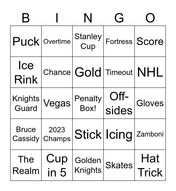 This bingo card has a free space and 31 words: Golden Knights, Hockey, Vegas, Goal, Puck, Stanley Cup, Chance, Icing, Off-sides, Skates, Gloves, Hat Trick, Adin Hill, Mark Stone, NHL, Parade, Zamboni, 2023 Champs, Bruce Cassidy, Stick, Score, Florida Panthers, The Realm, Overtime, Timeout, Ice Rink, Fortress, Knights Guard, Cup in 5, Gold and Black.