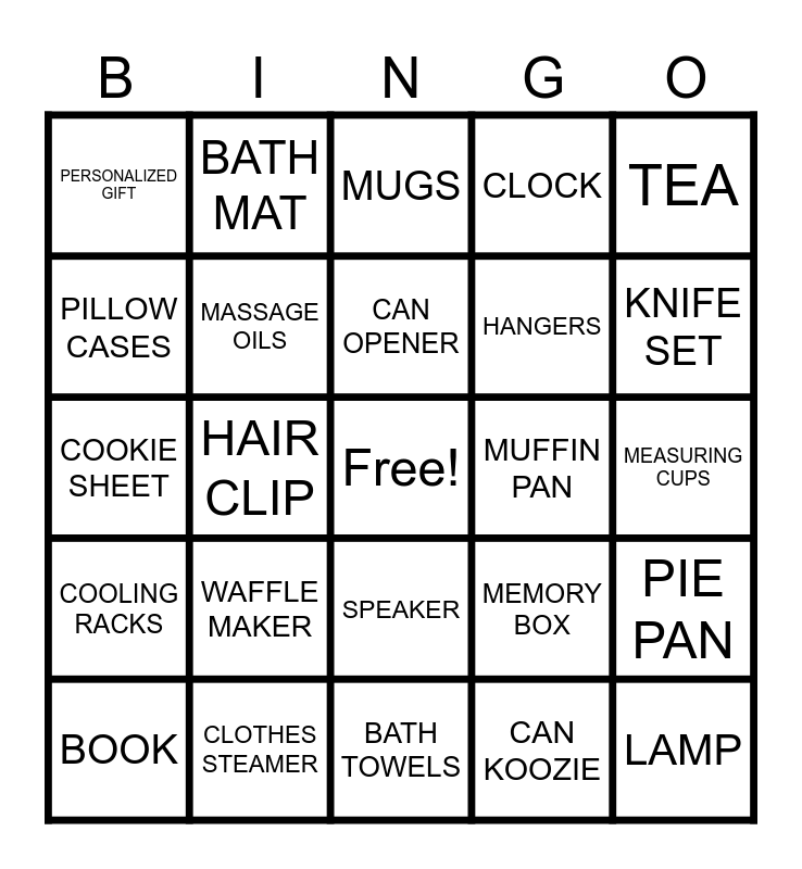 This bingo card has a free space and 122 words: AIR FRYER, ALCOHOL, AMAZON GIFT CARD, APRON, AREA RUG, BATH BOMBS, BATH MAT, BATH SALTS, BATH TOWELS, BATHROOM ACCESSORIES, BATHROOM RUG, BATTERY CANDLES, BED BLANKET, BED PILLOWS, BED SHEETS, BOARD GAME, BOOK, BRIDAL EMERGENCY KIT, BUBBLE BATH, CAKE PAN, CAN KOOZIE, CAN OPENER, CHARCUTERIE BOARD, CHARGER, CHEESE KNIVES, CLOCK, CLOTHES STEAMER, COASTERS, COFFEE MAKER, COLANDER, COMFORTER, COOKIE SHEET, COOLING RACKS, CORK PULLER, CROCK POT, CUTTING BOARD, DATE NIGHT IDEAS, DECORATIVE SHELVES, DINNER PLATES, ELECTRIC GRIDDLE, ESSENTIAL OIL DIFFUSER, ESSENTIAL OILS, FAN, FOOD CHOPPER, FOOD STORAGE, FRY PAN, GIFT CARD, GRILL, GUN CASE, HAIR CLIP, HAMPER, HANGERS, ICE CUBE TRAYS, JEWELRY, JEWELRY BOX, JEWELRY CLEANER, KITCHEN RUG, KITCHEN TOWELS, KITCHEN UTENSILS, KNIFE SET, LAMP, LAWN GAME, LINGERIE, LOAF PAN, LUGGAGE TAGS, MASSAGE OILS, MASSAGER, MEASURING CUPS, MEASURING SPOONS, MEMORY BOX, MUFFIN PAN, MUGS, OVEN MITTS, PAN RACK, PANTRY ORGANIZERS, PAPER TOWEL HOLDER, PERSONALIZED GIFT, PET BED, PET TOY, PHOTO ALBUM, PICTURE FRAME, PIE PAN, PILLOW CASES, PIZZA STONE, PLACEMATS, PLANT, QUILT, RECIPES, RING CAMERA/ALARM, ROBE, ROOMBA VACUUM, SCRUB BRUSH, SERVING DISH, SERVING TRAY, SHIRT, SILVERWARE, SOAP, SOUND MACHINE, SOUP BOWLS, SPEAKER, SPOON REST, STOCK POT, STORAGE BASKETS, STRAINERS, TABLE CLOTH, TEA, TEA KETTLE, THROW BLANKET, THROW PILLOW, TOASTER, TONGS, TOOLS, TRIVETS, VASE, WAFFLE MAKER, WALL ART, WASH CLOTHS, WATER GLASSES, WATER PITCHER, WINE GLASSES, WINE RACK and WINE STOPPER.