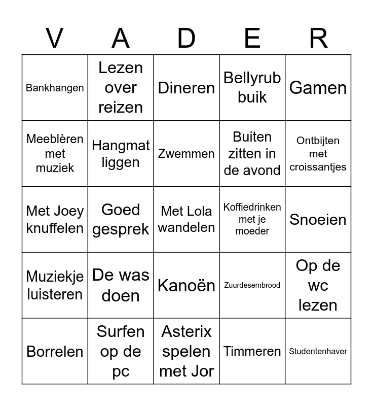 This bingo card has a free space and 24 words: De was doen, Surfen op de pc, Zwemmen, Borrelen, Gamen, Bankhangen, Meeblèren met muziek, Lezen over reizen, Koffiedrinken met je moeder, Kanoën, Buiten zitten in de avond, Met Joey knuffelen, Zuurdesembrood, Op de wc lezen, Hangmat liggen, Timmeren, Snoeien, Dineren, Ontbijten met croissantjes, Goed gesprek, Studentenhaver, Muziekje luisteren, Bellyrub buik and Asterix spelen met Jor.