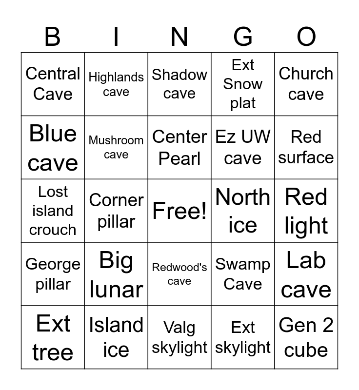 This bingo card has a free space and 24 words: Big lunar, Island ice, Center Pearl, Ext tree, Church cave, Central Cave, Blue cave, Highlands cave, North ice, Redwood's cave, Ez UW cave, Lost island crouch, Swamp Cave, Lab cave, Mushroom cave, Ext skylight, Red light, Shadow cave, Red surface, Corner pillar, Gen 2 cube, George pillar, Ext Snow plat and Valg skylight.