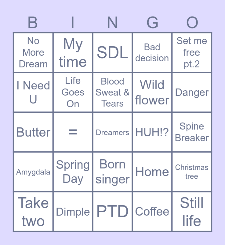 This bingo card has 25 words: Spring Day, PTD, Blood Sweat & Tears, Take two, Set me free pt.2, No More Dream, I Need U, My time, HUH!?, Born singer, Wild flower, Butter, Home, Christmas tree, Life Goes On, Still life, Spine Breaker, SDL, Danger, =, Dreamers, Dimple, Amygdala, Bad decision and Coffee.