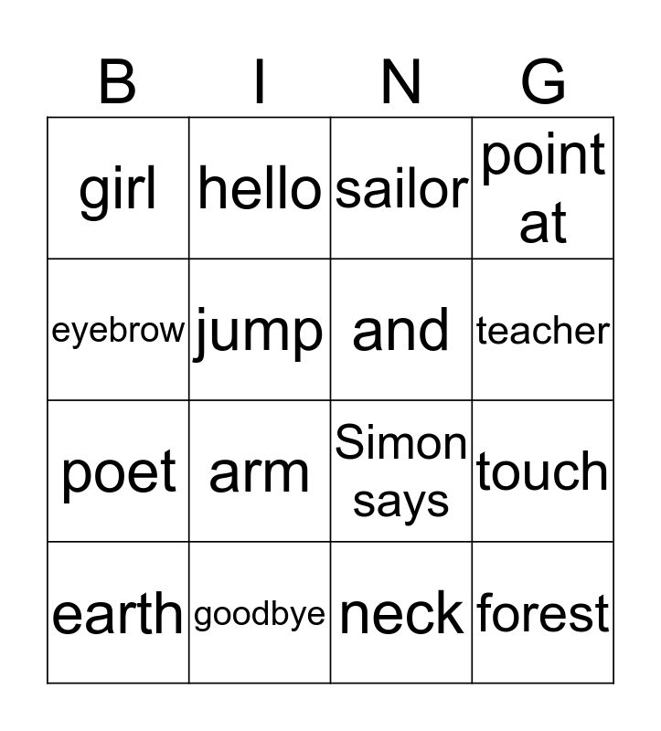 This bingo card has a free space and 15 words: earth, forest, sailor, girl, teacher, eyebrow, arm, neck, jump, poet, touch, point at, and, hello and goodbye.