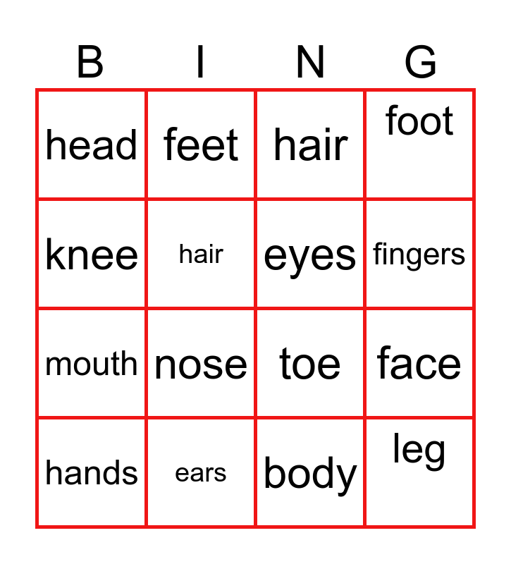 This bingo card has 16 words: hands, ears, hair, foot, knee, feet, toe, face, head, hair, body, fingers, mouth, nose, eyes and leg.