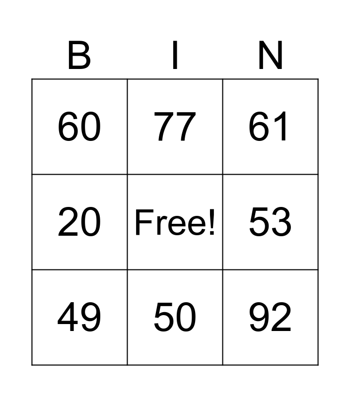 This bingo card has a free space and 27 words: 12, 23, 34, 45, 53, 61, 77, 82, 90, 99, 15, 20, 28, 30, 39, 40, 49, 50, 55, 60, 69, 70, 78, 80, 84, 92 and 96.
