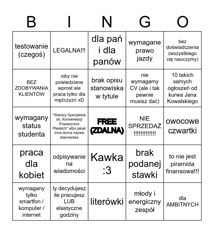 This bingo card has a free space and 42 words: tygodniówki, brak opisu stanowiska w tytule, heloł fellow kids : D, odpisywanie na wiadomości, młody i energiczny zespół, to nie jest piramida finansowa!!!, dla AMBITNYCH, karnety na baseny i siłownie, dla pań i dla panów, Kawka :3, owocowe czwartki, 10 takich samych ogłoszeń od kurwa Jana Kowalskiego, "Starszy Specjalista ds. Konserwacji Powierzchni Płaskich" albo jakaś inna durna nazwa stanowiska, bez doświadczenia (wszystkiego cię nauczymy), darmowe kursy językowe, brak podanej stawki, B2B, wymagany status studenta, praca szuka człowieka, LEGALNA!!!, BEZ ZDOBYWANIA KLIENTÓW, chuj wie jaka firma, SZKOŁY JĘZYKOWE ONLINE XD, testowanie (czegoś), dla osoby z orzeczeniem, sklep internetowy, nie wymagamy CV (ale i tak pewnie musisz dać), WITAJ MATURZYSTO, praca za granicą, 6 lat doświadczenia i profesura za 3.5K, QUIZ REKRUTACYJNY XD, praca dla kobiet, niby nie powiedziane wprost ale praca tylko dla mężczyzn xD, literówki, widełki pokroju 2K-50K, wymagany tylko smartfon / komputer / internet, ty decydujesz ile pracujesz LUB elastyczne godziny, NIE SPRZEDAŻ !!!!!!!!!!!!!, konkursy for some reason?, nic nie musisz inwestować, wymagane prawo jazdy and wypełnianie ankiet.