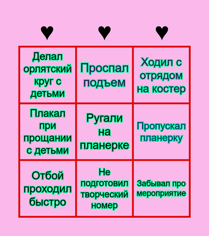 This bingo card has a free space and 8 words: Пропускал планерку, Ходил с отрядом на костер, Проспал подъем, Отбой проходил быстро, Делал орлятский круг с детьми, Забывал про мероприятие, Плакал при прощании с детьми and Не подготовил творческий номер.