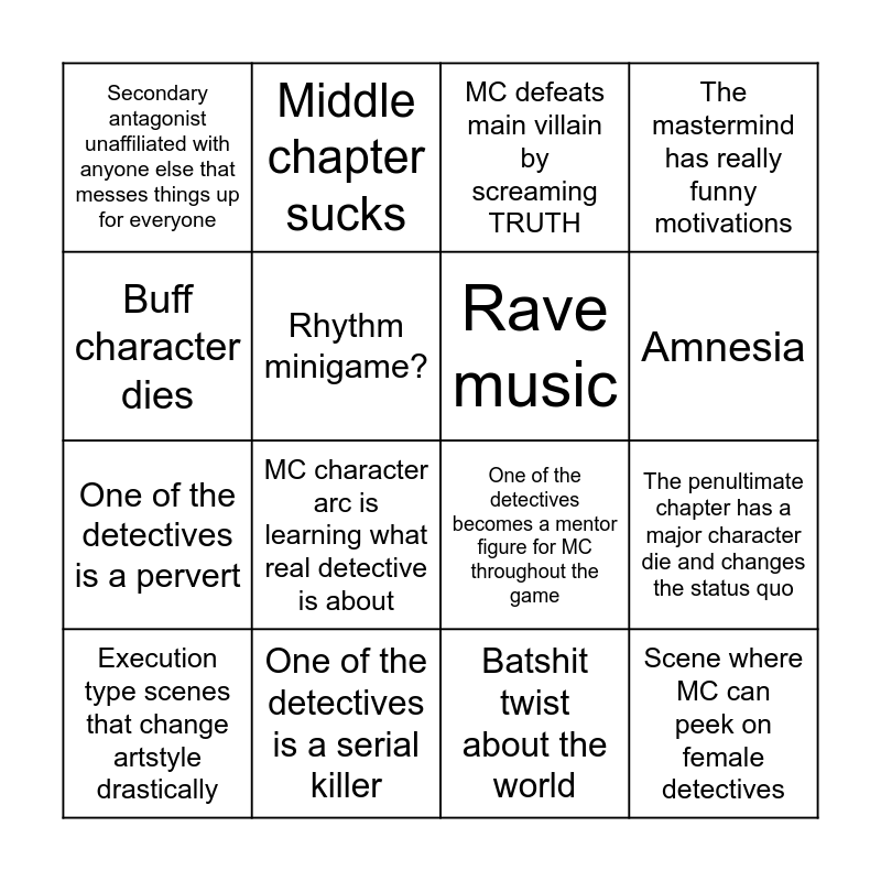 This bingo card has 16 words: One of the detectives is a serial killer, The penultimate chapter has a major character die and changes the status quo, MC defeats main villain by screaming TRUTH, Secondary antagonist unaffiliated with anyone else that messes things up for everyone, One of the detectives is a pervert, Middle chapter sucks, One of the detectives becomes a mentor figure for MC throughout the game, Batshit twist about the world, Buff character dies, Rhythm minigame?, Execution type scenes that change artstyle drastically, The mastermind has really funny motivations, MC character arc is learning what real detective is about, Amnesia, Rave music and Scene where MC can peek on female detectives.
