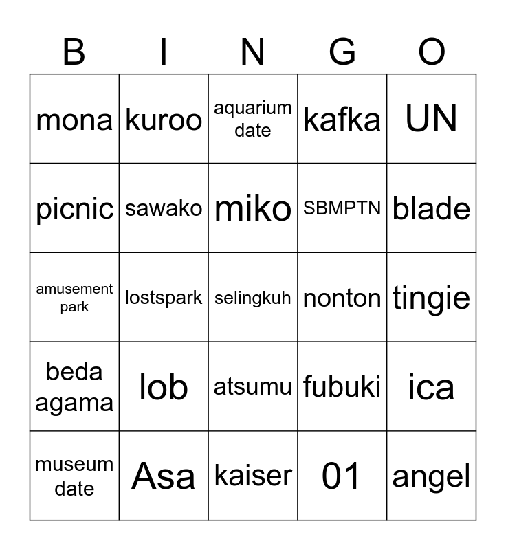 This bingo card has a free space and 24 words: lob, Asa, miko, museum date, UN, mona, picnic, kuroo, nonton, atsumu, SBMPTN, amusement park, fubuki, ica, sawako, 01, tingie, aquarium date, blade, lostspark, angel, beda agama, kafka and kaiser.