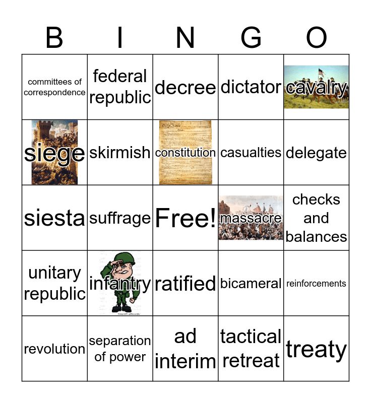 This bingo card has 5 images, a free space and 24 words: infantry, separation of power, constitution, revolution, cavalry, committees of correspondence, siege, federal republic, massacre, ratified, casualties, siesta, bicameral, reinforcements, skirmish, tactical retreat, checks and balances, decree, delegate, suffrage, treaty, unitary republic, dictator and ad interim.